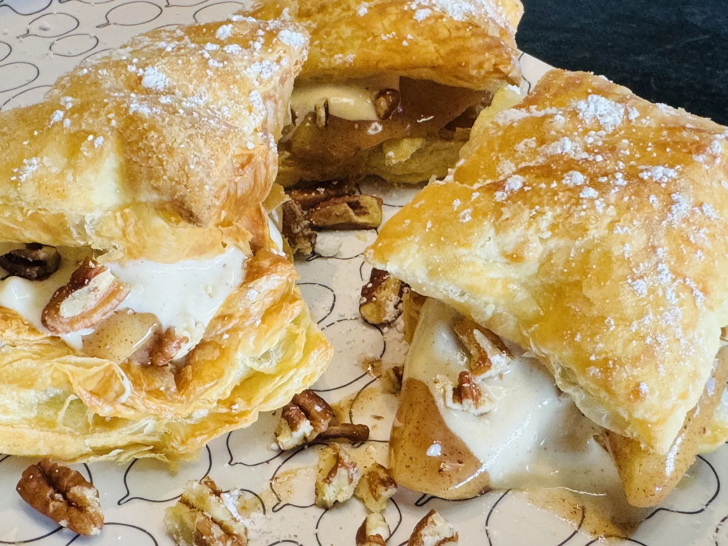 This dreamy dessert takes classic apple pie to a whole new level. Sweet apple pie filling is tucked between flaky pastry shells to create a warm, handheld sandwich. It's finished with a smooth, creamy topping, a sprinkle of crunchy pecans, and a dusting of powdered sugar for the perfect touch of elegance and indulgence in every bite.
