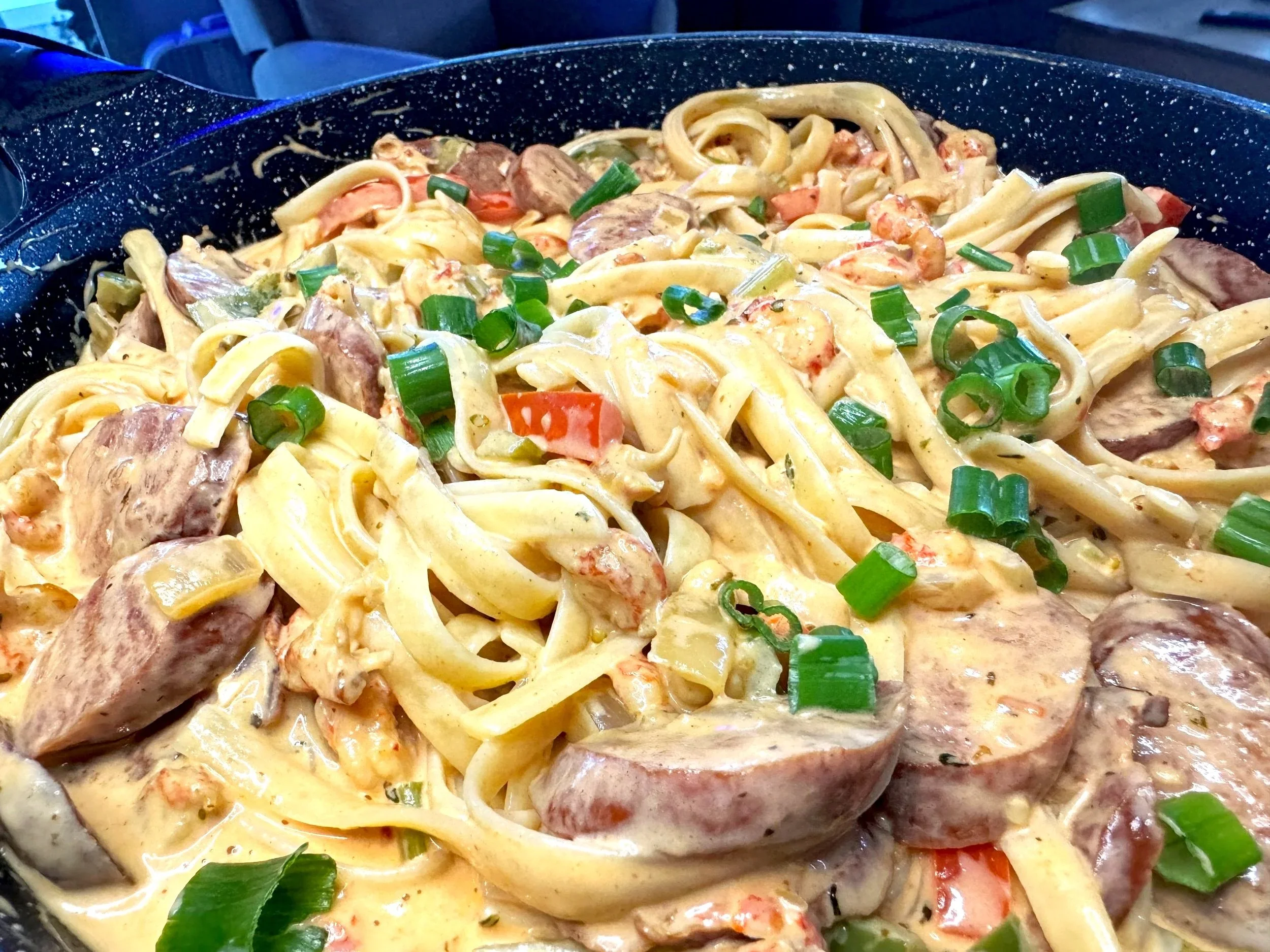Crawfish and Cajun Sausage Fettuccine is a rich, creamy, and bold Southern-inspired pasta dish that brings the heart of Louisiana to your table. This recipe features tender crawfish tails and spicy Cajun sausage sautéed with a medley of colorful veggies, then simmered in a luscious tomato cream sauce made with tomato paste and heavy cream. Tossed with perfectly cooked fettuccine noodles, every bite is packed with smoky heat and comforting flavor. It's the perfect fusion of spice, seafood, and soul—ideal for a cozy dinner or impressing guests with a taste of the bayou.